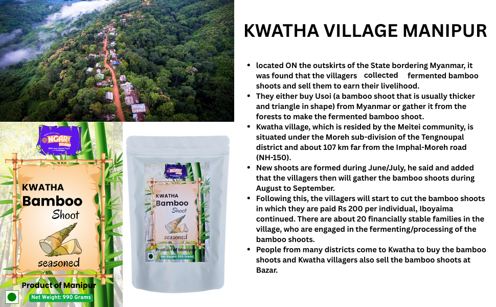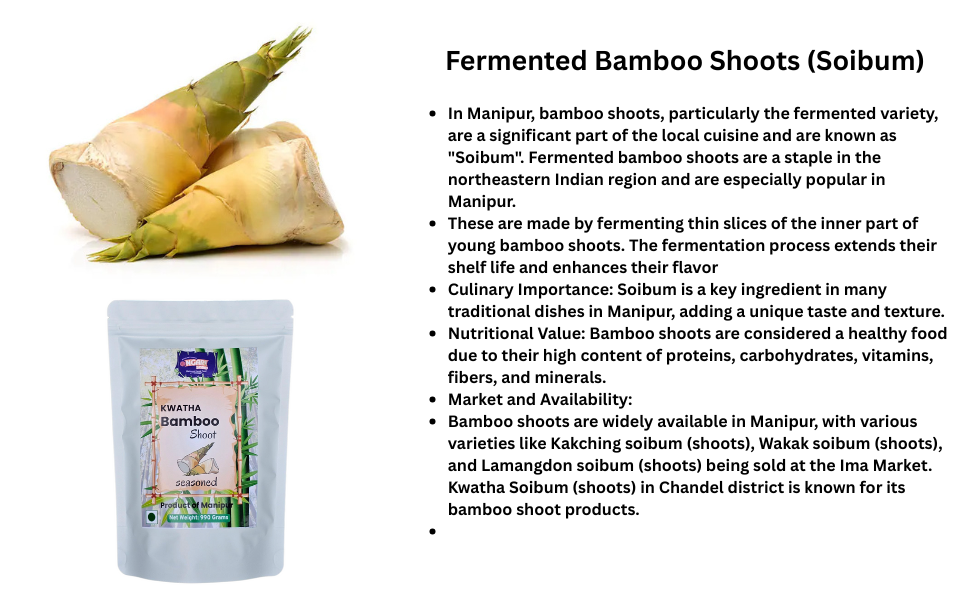 • AUTHENTIC MANIPURI: Bamboo Shoots are widely available in Manipur and the Northeast region and can be bought with less price with large quality and no taste. Kwatha Soibum (bamboo shoot) is the best.