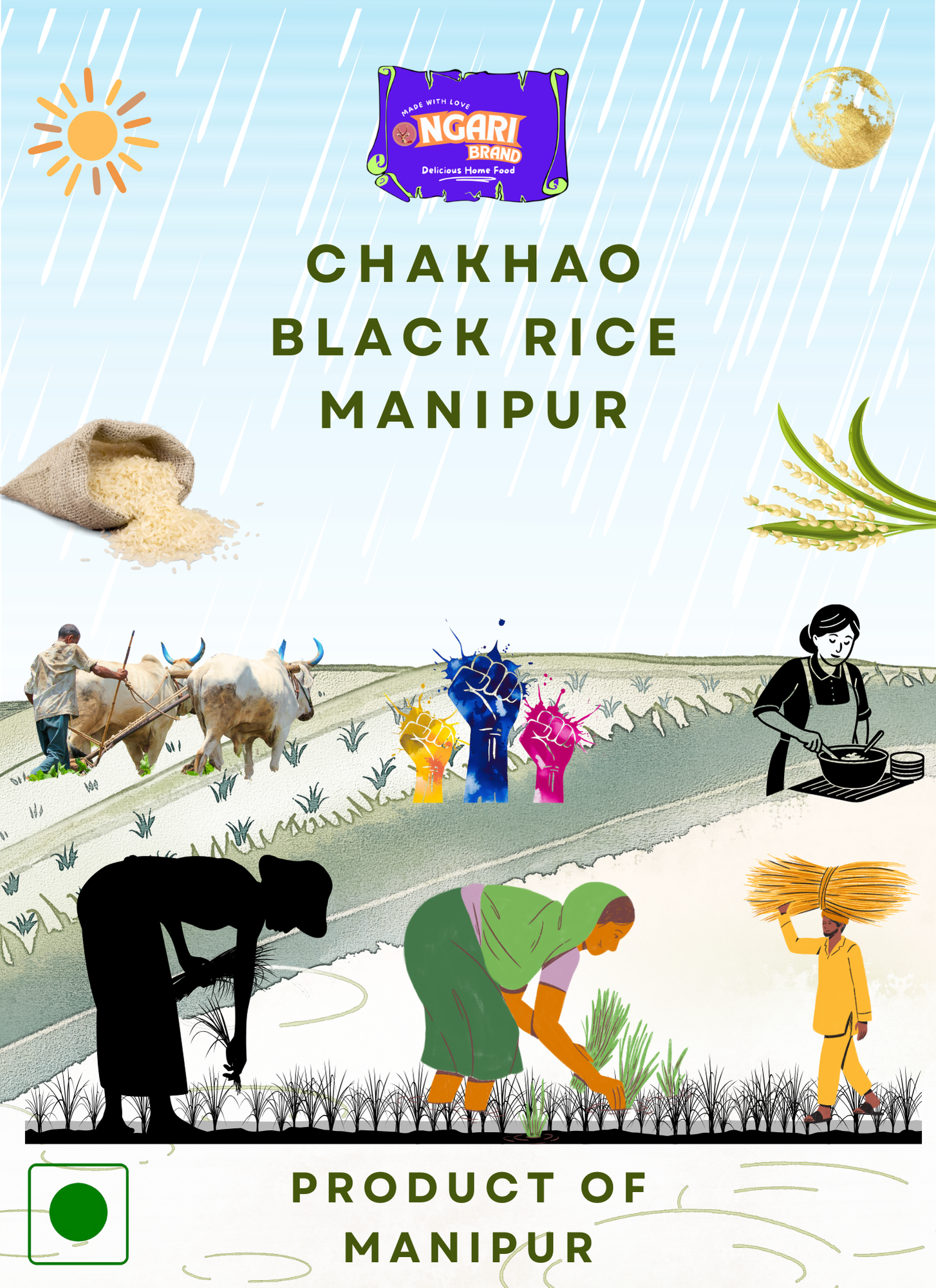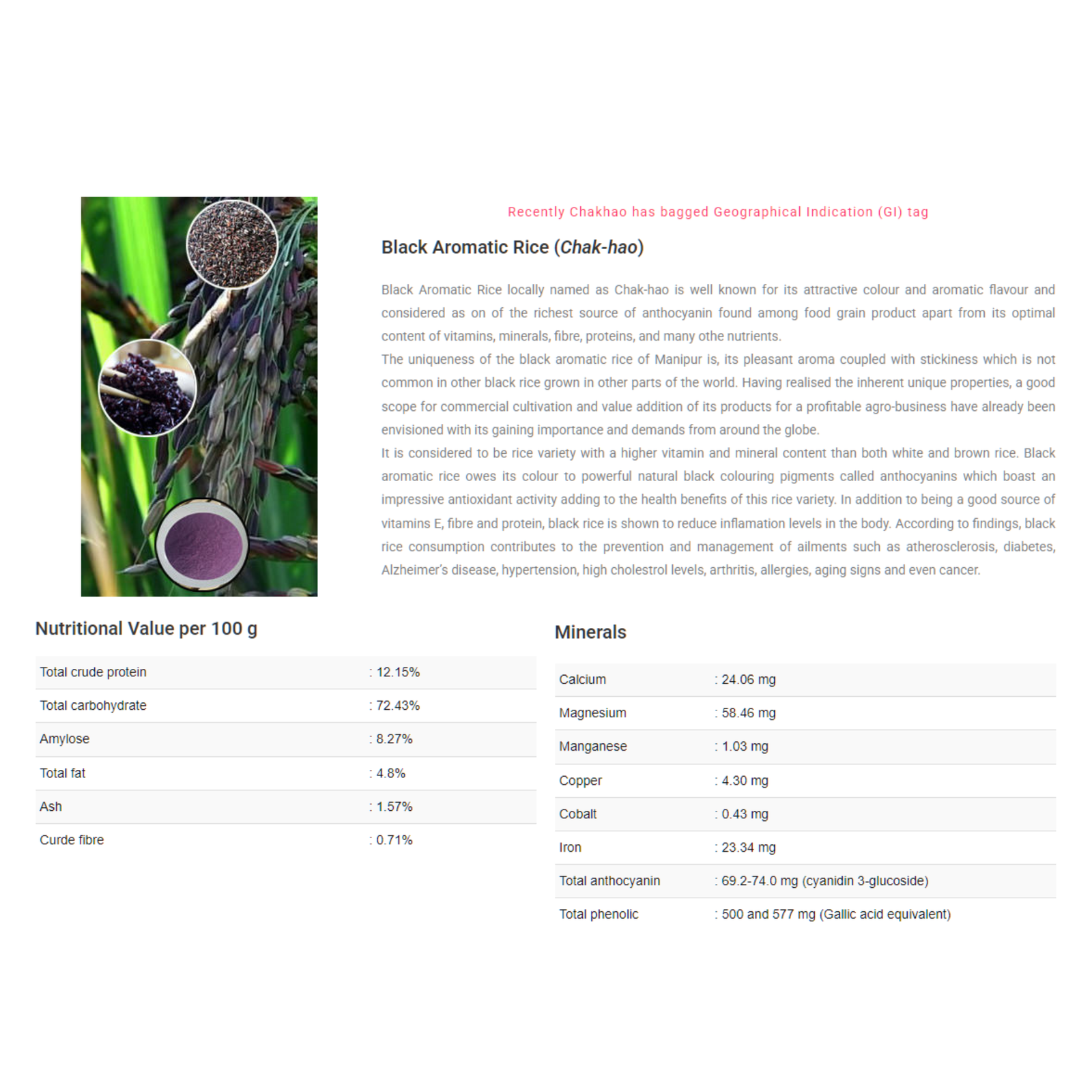 Black Aromatic Rice is one of the superfoods well known for its attractive colour and aromatic flavour. It is considered one of the richest sources of anthocyanins found among the food grains. The uniqueness of the black aromatic rice of Manipur is its pleasant aroma coupled with stickiness which is not common in other black rice grown in other parts of the world. First cultivated by King Poireiton in his land “Poi”, Poi is the first generation of Manipur Society, hence the Black Rice is also called as Poireiton Chakhao (Chak=Rice, Hao=Delicious). Chak-Hao (Black Rice of Manipur) has been conferred with the Geographical Indication (GI) Status by the Government of India in 2019 with the GI Number 364.